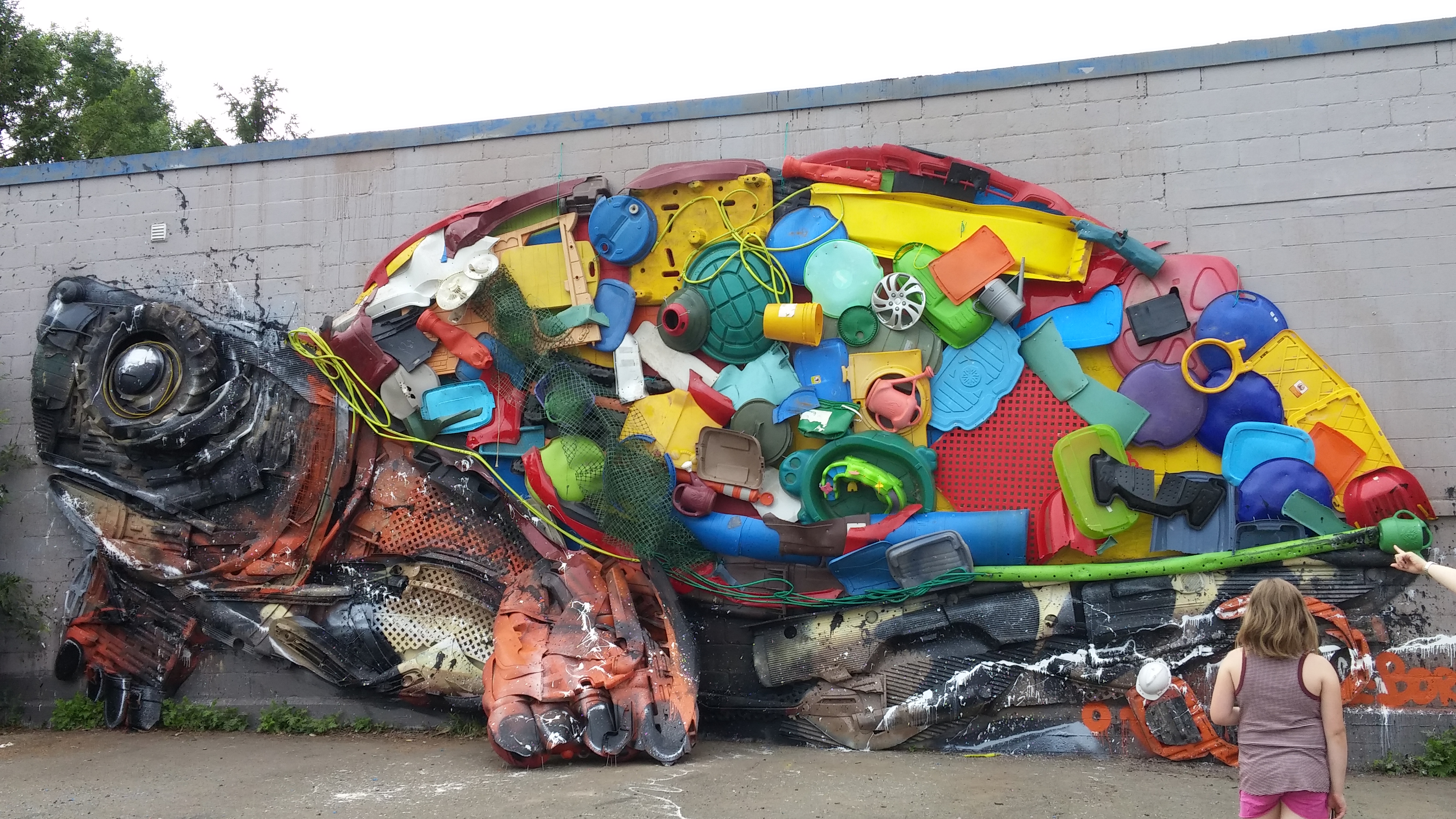 The turtle was created by an artist based out of Portugal named Bordalo II, using pieces of plastic garbage from around the city and from the recycle centre. It’s a stunning piece to see in person, emerging in three-dimensions from the side of the building.