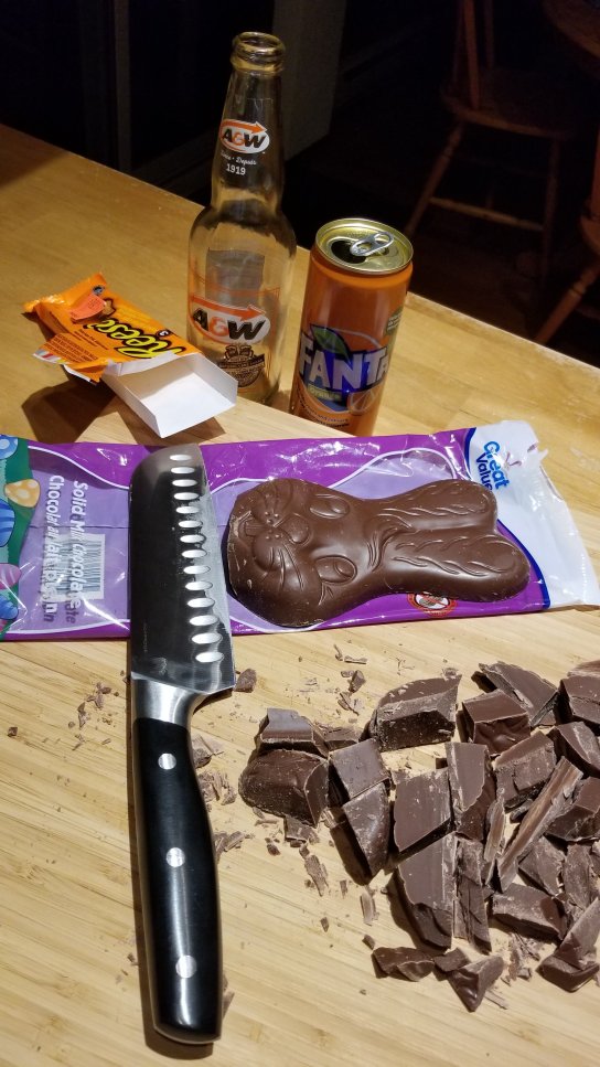 Reese Peanut Butter Cups, a bottle of root beer, a can of Fanta and some (not exactly fresh any longer) chocolate bunny pieces. Just eating away my emotions and frustrations. So no kids, it isn’t always rainbows and sunshine in Chris’ world.