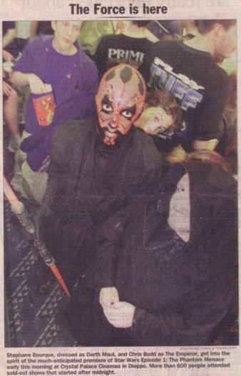 While people will forever debate the value and necessity of the prequel trilogy, I will always have a soft spot for Episode 1: The Phantom Menace. It was the first Star Wars movie that I was able to experience in a theatre. I got to camp out and have fun with friends to create an experience. I even made the front page of the newspaper a couple of times over those few weeks. First, we were interviewed about camping out for tickets, and then I was photographed on opening night when I dressed up to attend the premiere with another friend. Yes, I was that guy.