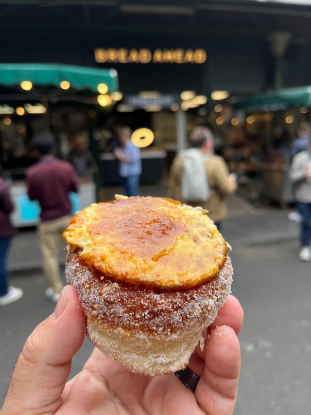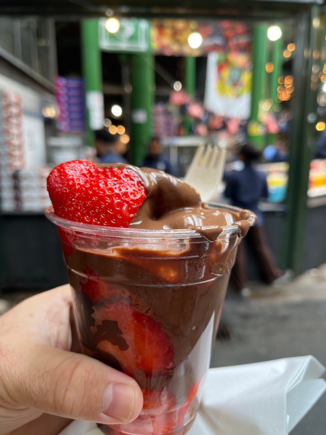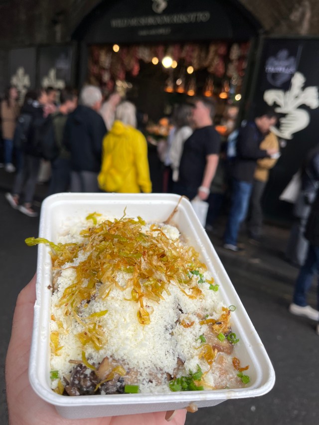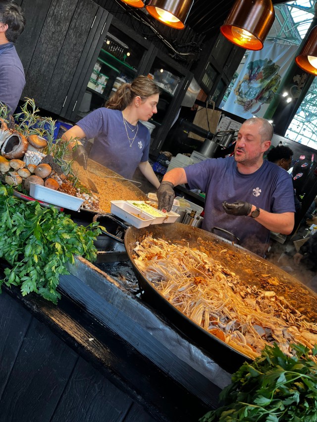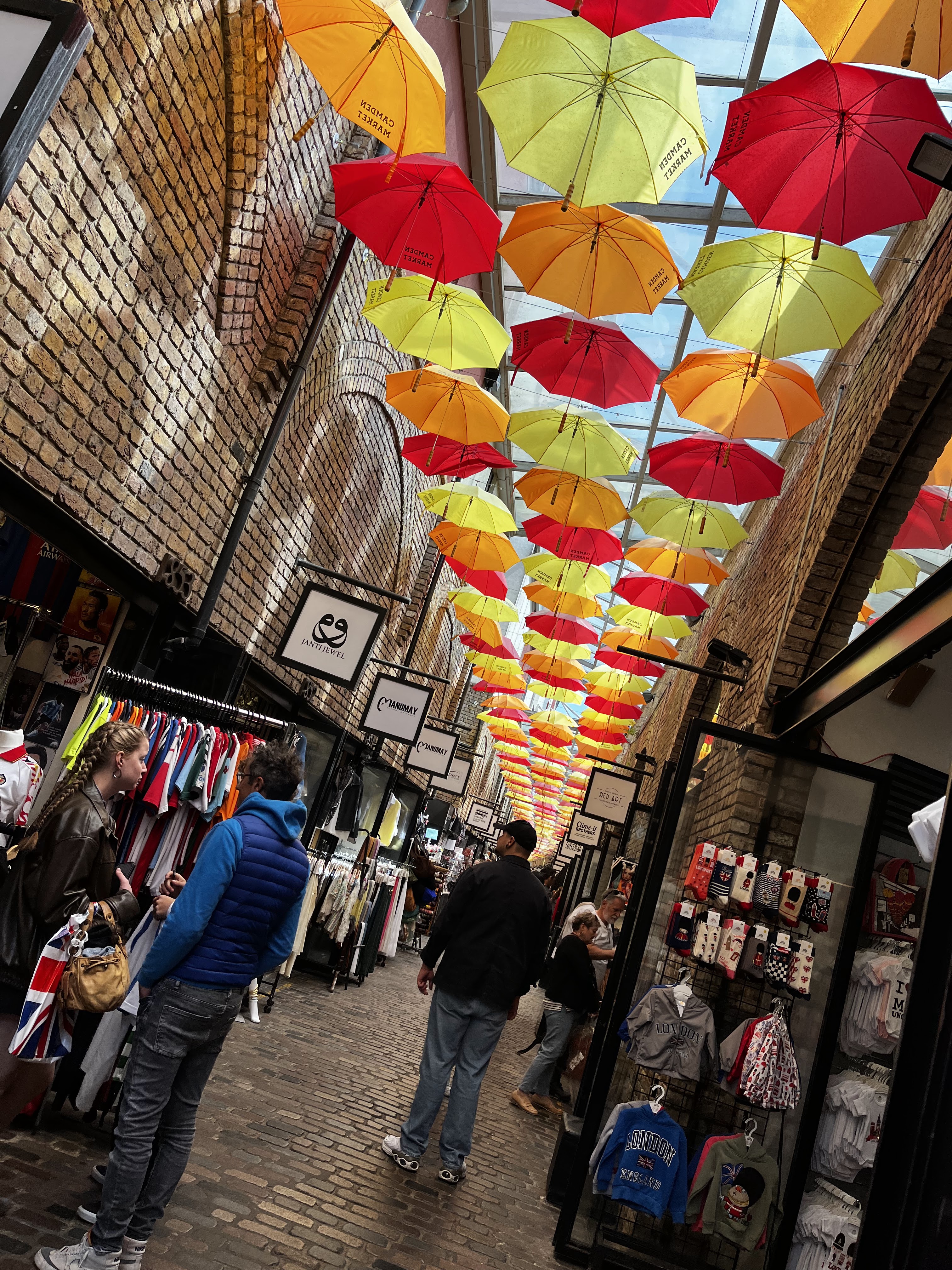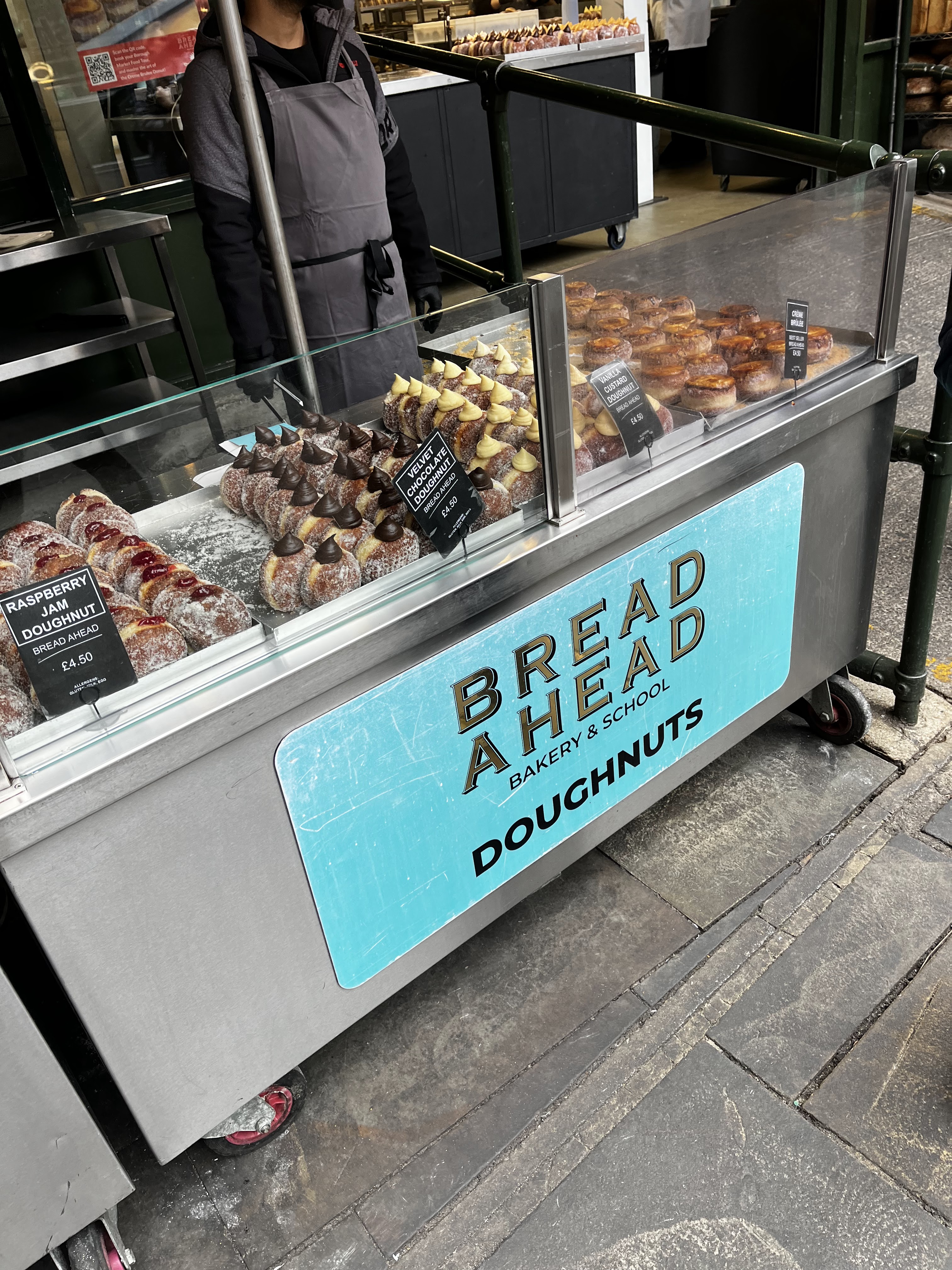Apart the parks, our two favourite locations were the markets we visited. First up was Borough Market. One of the largest markets in London, it has been in operation in this location since the 1750’s. Offering a variety of food and shopping vendors, there is something for everyone here. We had some of our best eats at the Borough Market, including a crème brûlée donut from Bread Ahead (as showcased on Somebody Feed Phil), a spectacularly delicious wild mushroom risotto, and delectable strawberries smothered in melted chocolate. Such a good food day!